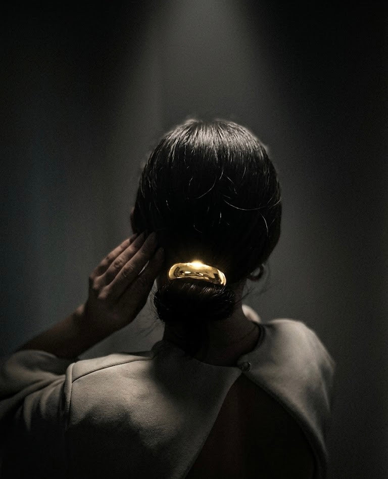 L'elastico THE MOON cattura la luce e la trasforma in un riflesso lunare tra i tuoi capelli. Un vero gioiello di lusso quotidiano, progettato in lega ecologica ultra-brillante per chi vuole risplendere con carattere, senza mai passare inosservata.